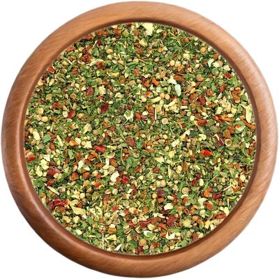Ta łagodnie pikantna mieszanka przypraw bez soli nadaje grillowanemu mięsu, rybom, drobiu, ale także grillowanym warzywom przyjemny ziołowy smak. Ponadto, dzięki kminkowi i kolendrze, po wspaniałym przyjęciu z grilla, ziołowa mieszanka przypraw ułatwi trawienie.